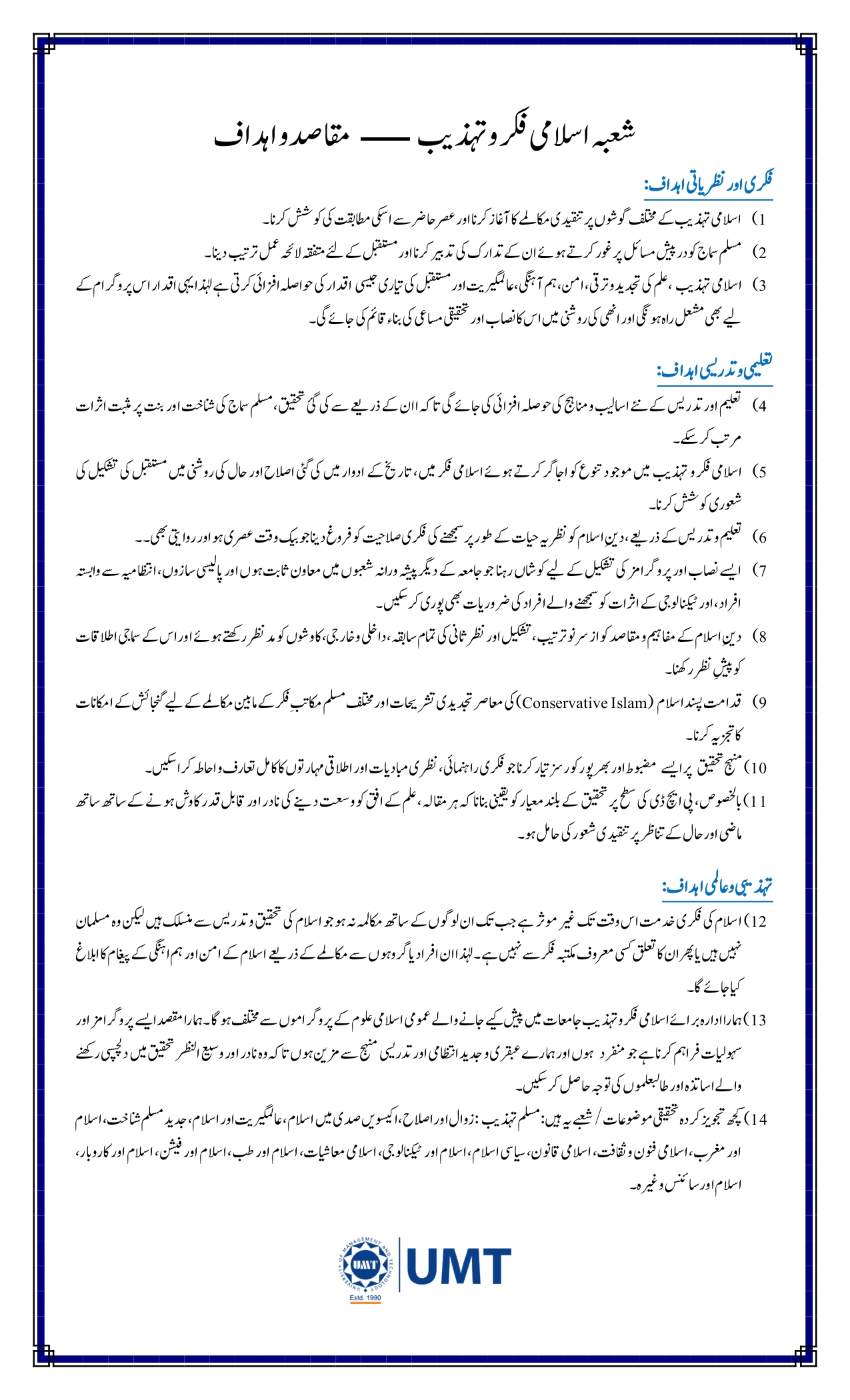 Department of Islamic Thought and Civilization (ITC) – Categorized Objectives