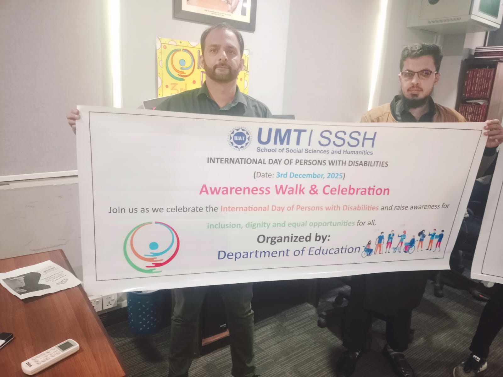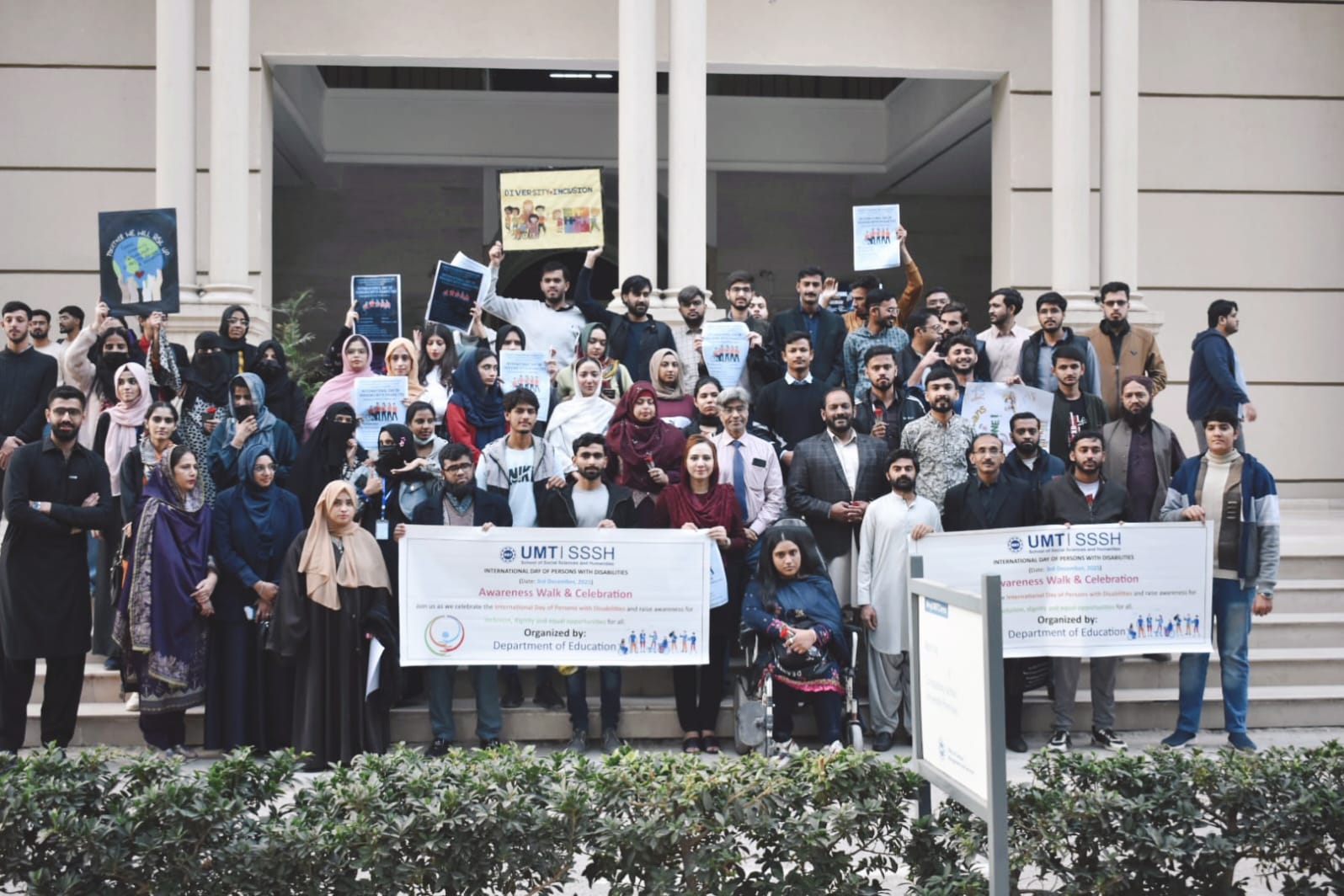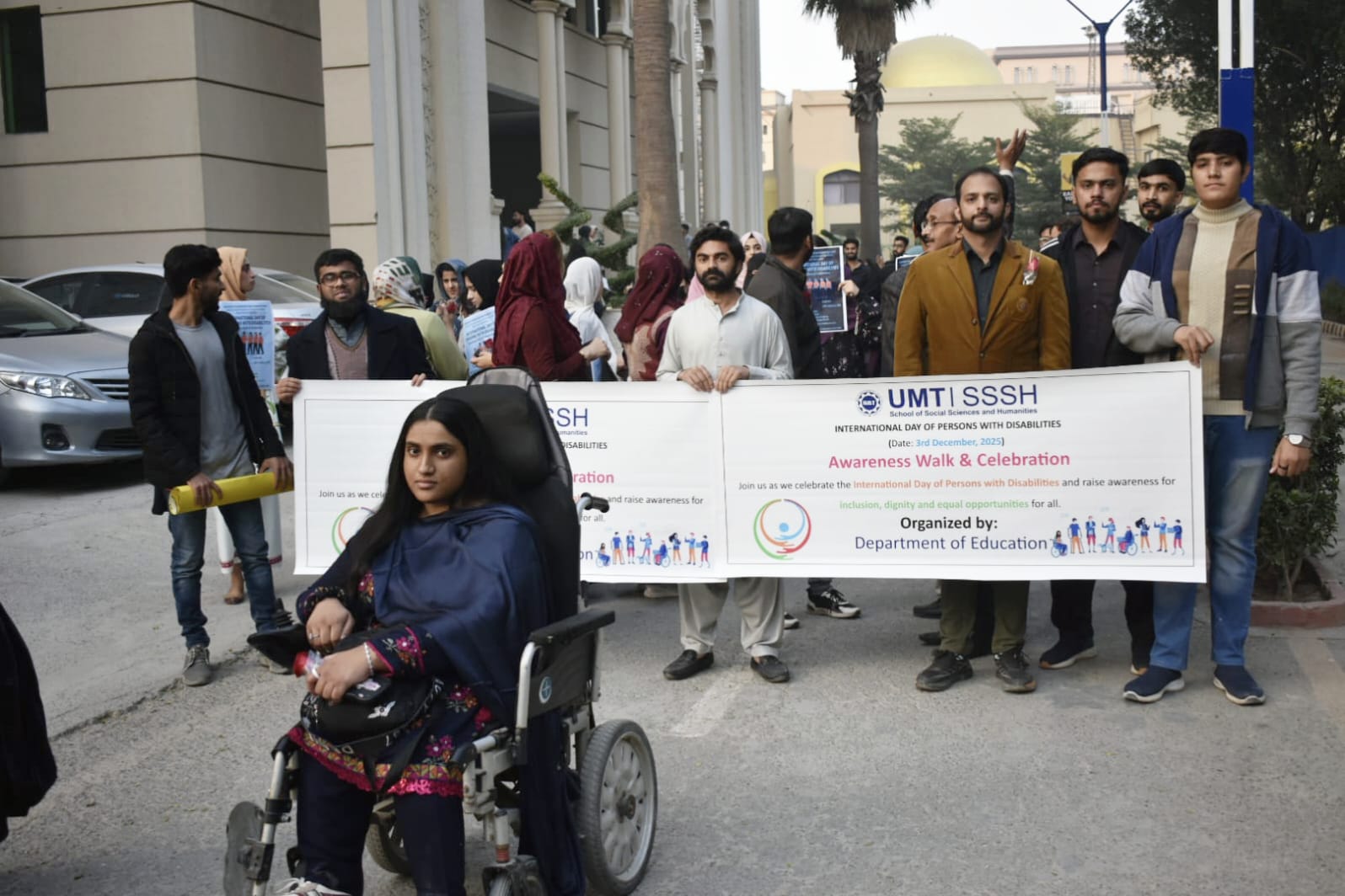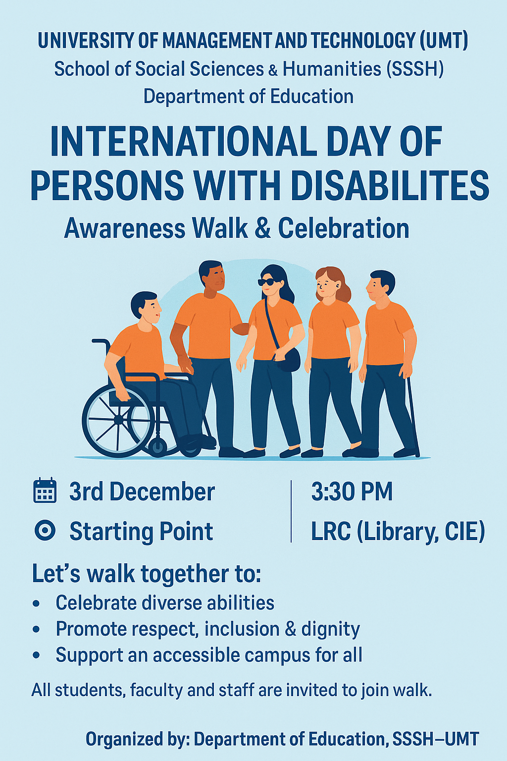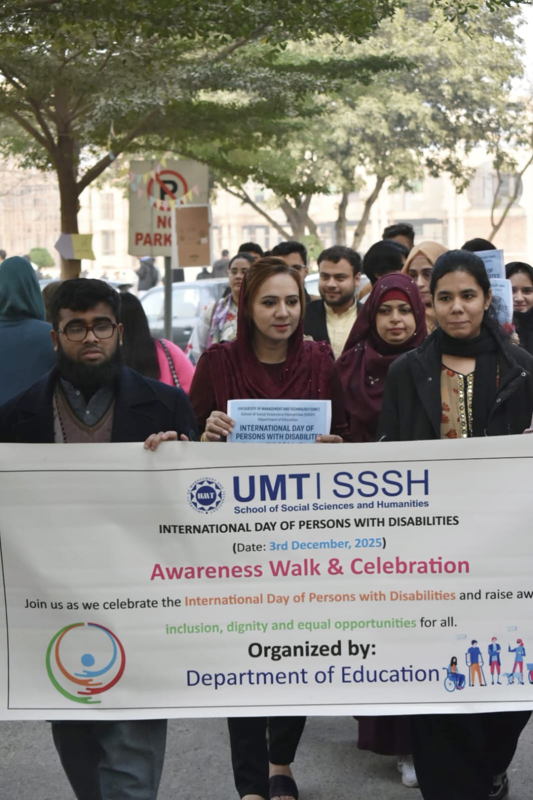Description: The Department of Education, School of Social Sciences & Humanities (SSSH), University of Management and Technology (UMT), organized an “International Day of Persons with Disabilities – Awareness Walk & Celebration” on December 3. The event was held on campus with the purpose of promoting inclusion, respect, and dignity for persons with disabilities.